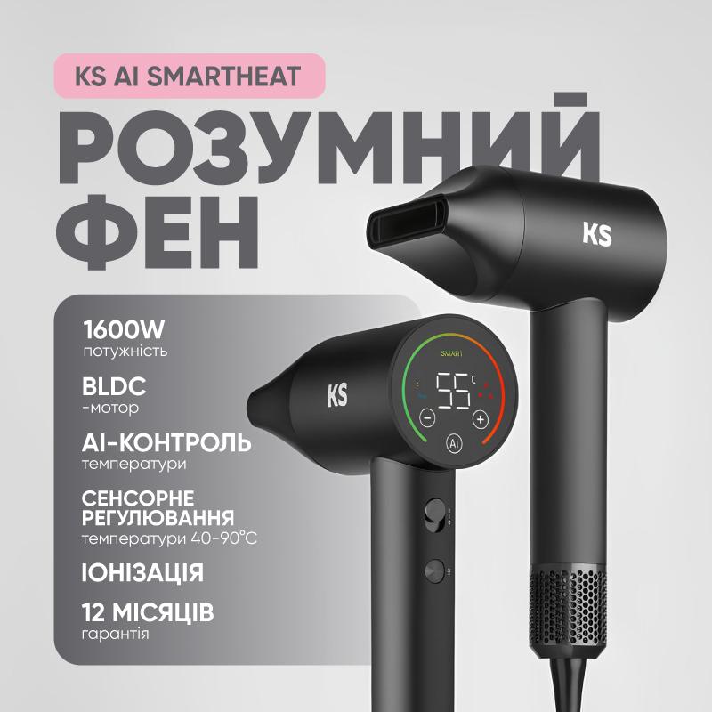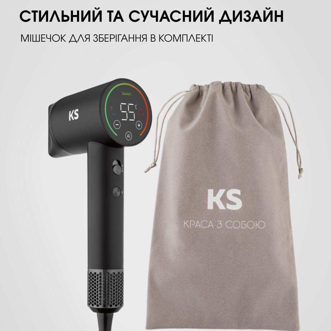 У комплекті: фен KS AI Smartheat, мішечок для зберігання фену, магнітний концентратор, інструкція, гарантія.