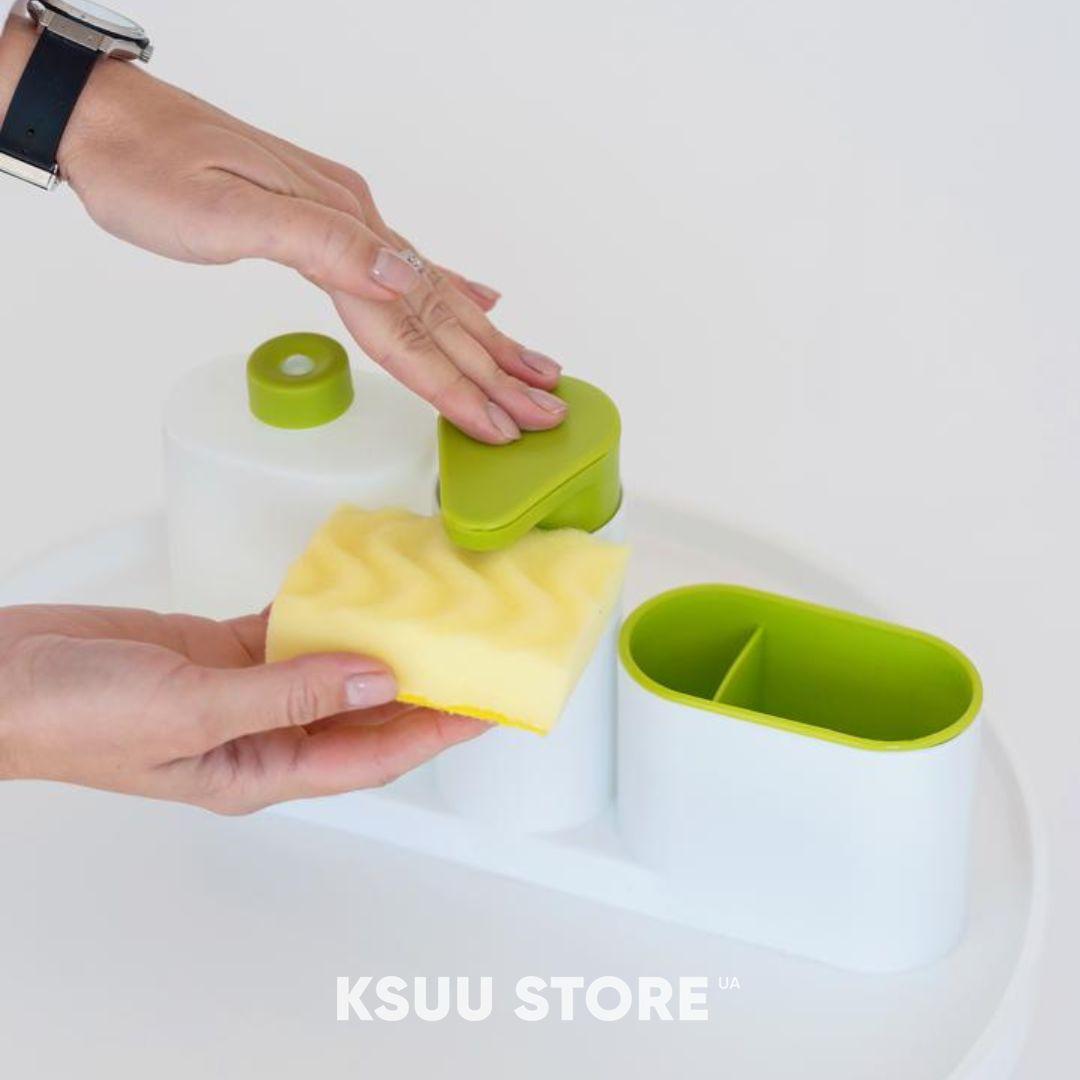 Тепер простір за кухонною раковиною використовуватиметься з максимальною ефективністю У ньому передбачена підставка з двома відділеннями для щіток та губок, ємність для рідких миючих засобів та дозатор для мила.