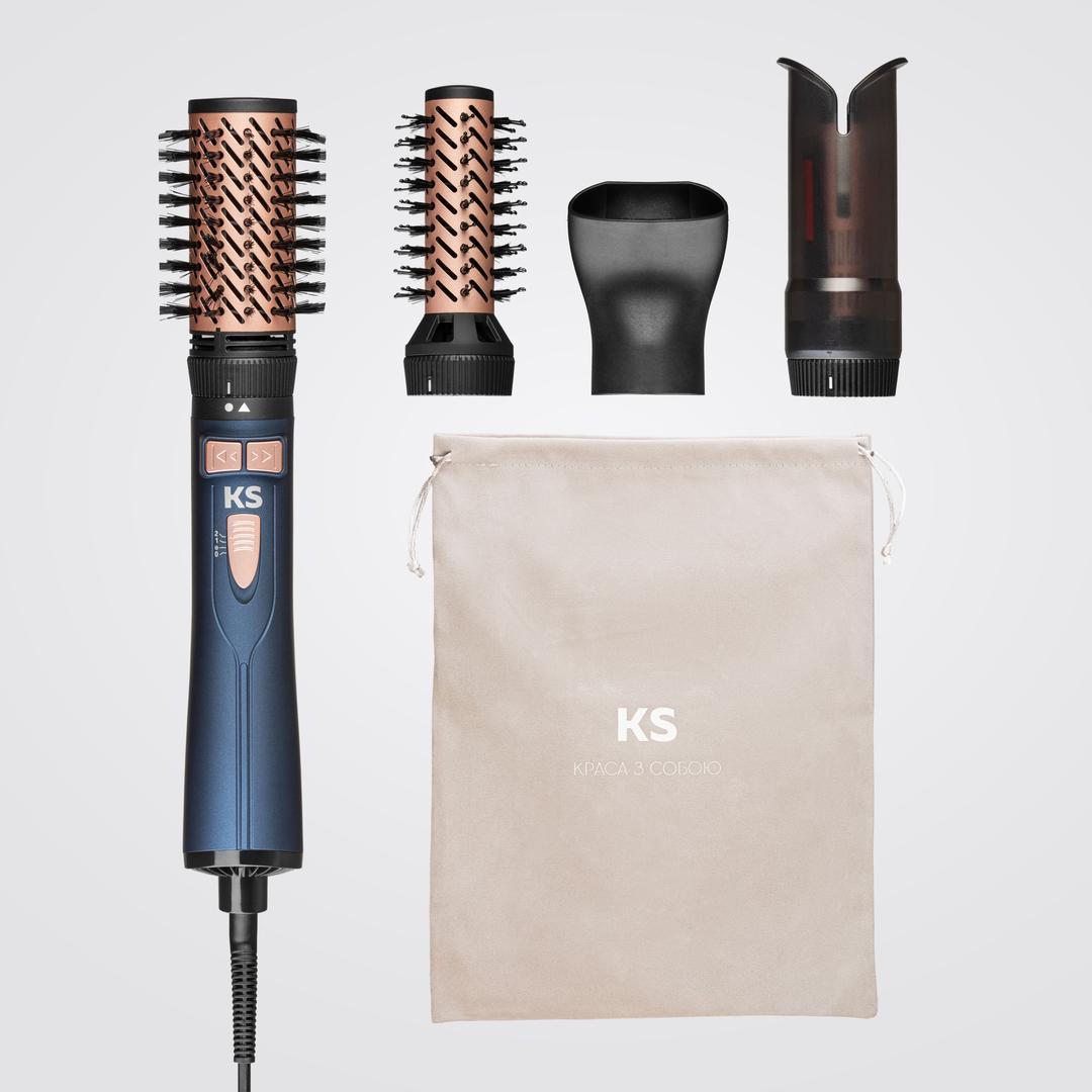 KS 4in1H302 - многофункциональный стайлер, который объединяет сразу четыре насадки для разных стилей укладки. Это универсальный инструмент, способный заменить фен, брашинг и плойку, позволяя создавать любые образы – от идеально гладкой причёски до упругих локонов.