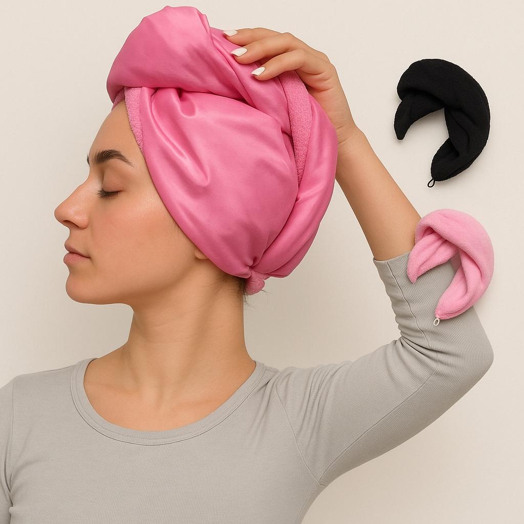 Завдяки зручному кріпленню - петелька + гудзик, рушник легко фіксується на голові та не сповзає під час використання. Його можна комфортно носити під час домашніх справ, доглядових процедур чи відпочинку після душу.